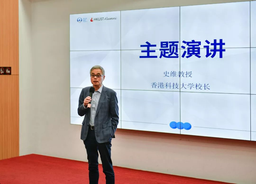 紧接着,香港科技大学校长史维教授进行了主题演讲。史校长向在场的校友分享了科大在大湾区内的布局,他提到,广州校区的面积远超香港本部,发展空间更是十分广阔,科大会更着力于在新校区发展一些全新的学科。他勉励众校友要抓住这百年难遇的湾区科创机遇,与科大一同奋勇前行。